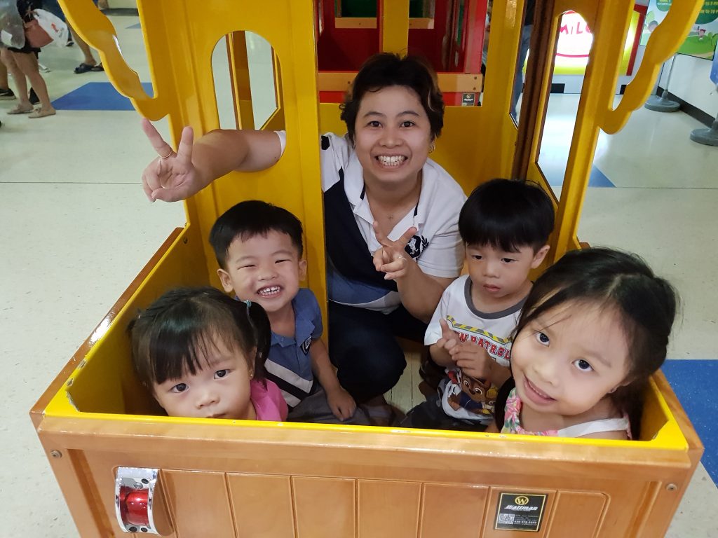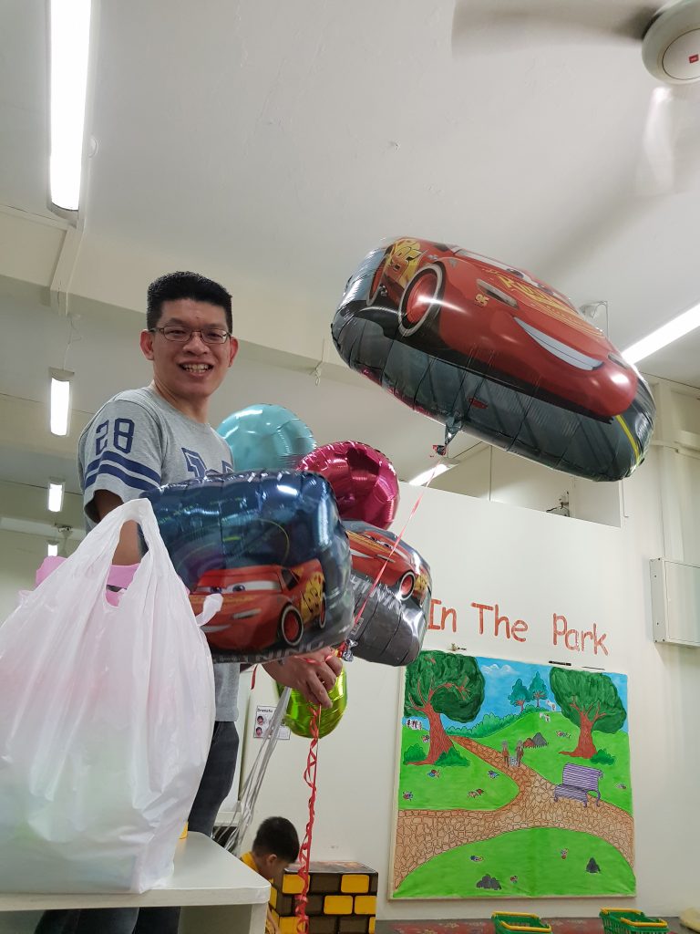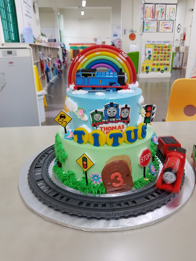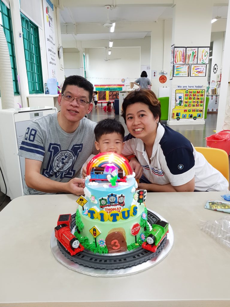 The celebration at childcare, we were quite worried as the last year when he celebrated his birthday, he didn’t quite enjoy it. He didn’t want anyone to touch his cake, let alone eat it. However, this year he embraced it well, most of the kids were amazed with the moving train, likewise, we can hardly keep his hands off the cake. He got to serve the cake to the kids, not forgetting to give the first slide of cake to his “girlfriend” then to the rest of the kids. Likewise, his favourite teacher and then to the rest of the teachers as well. All in all, it went well, and daddy brought some balloons, 27 in fact, last minute to give 1 each to the kids created some chaos.